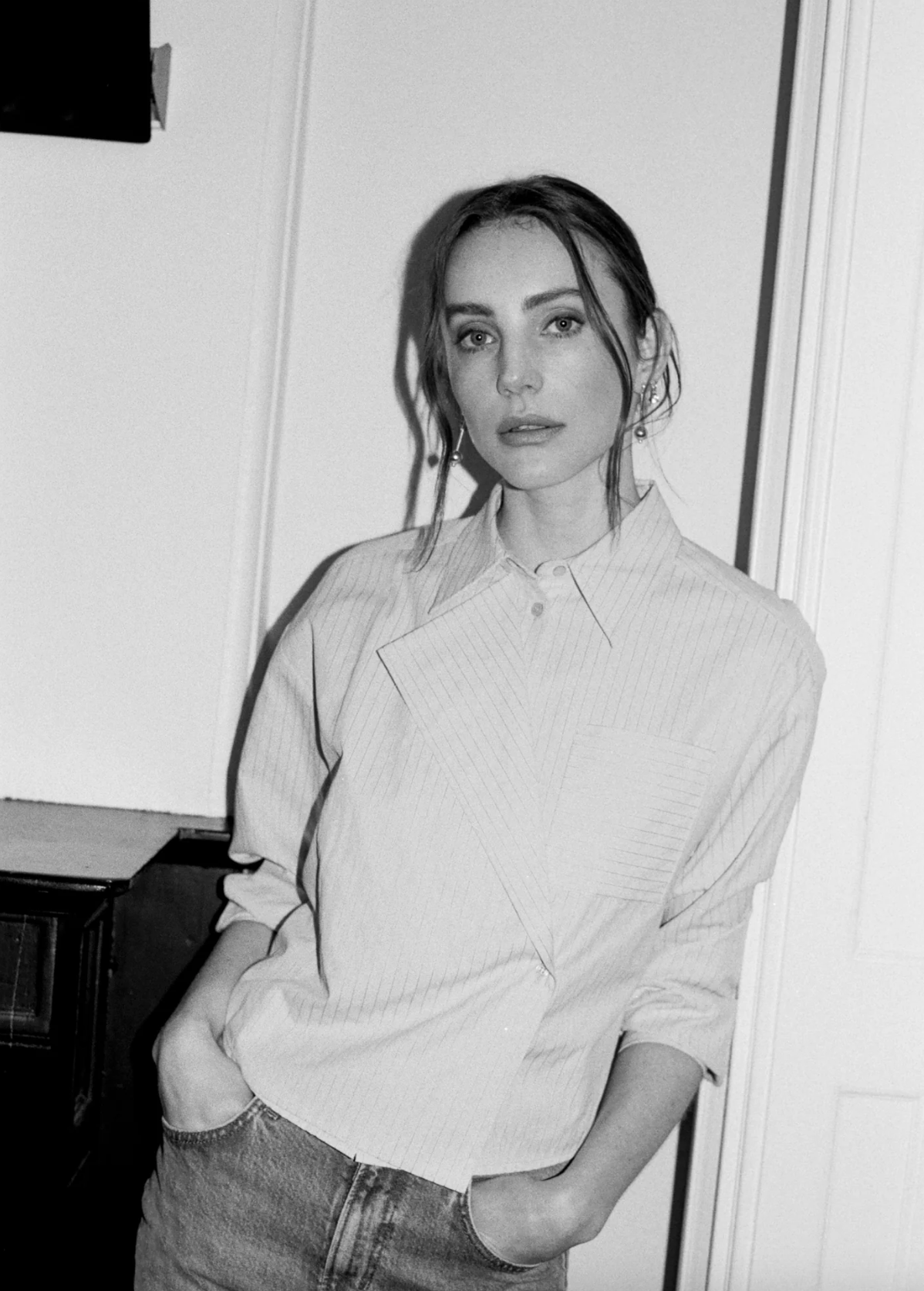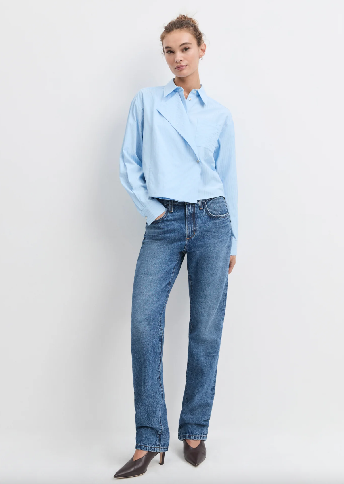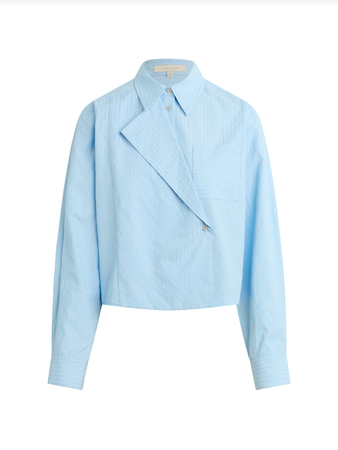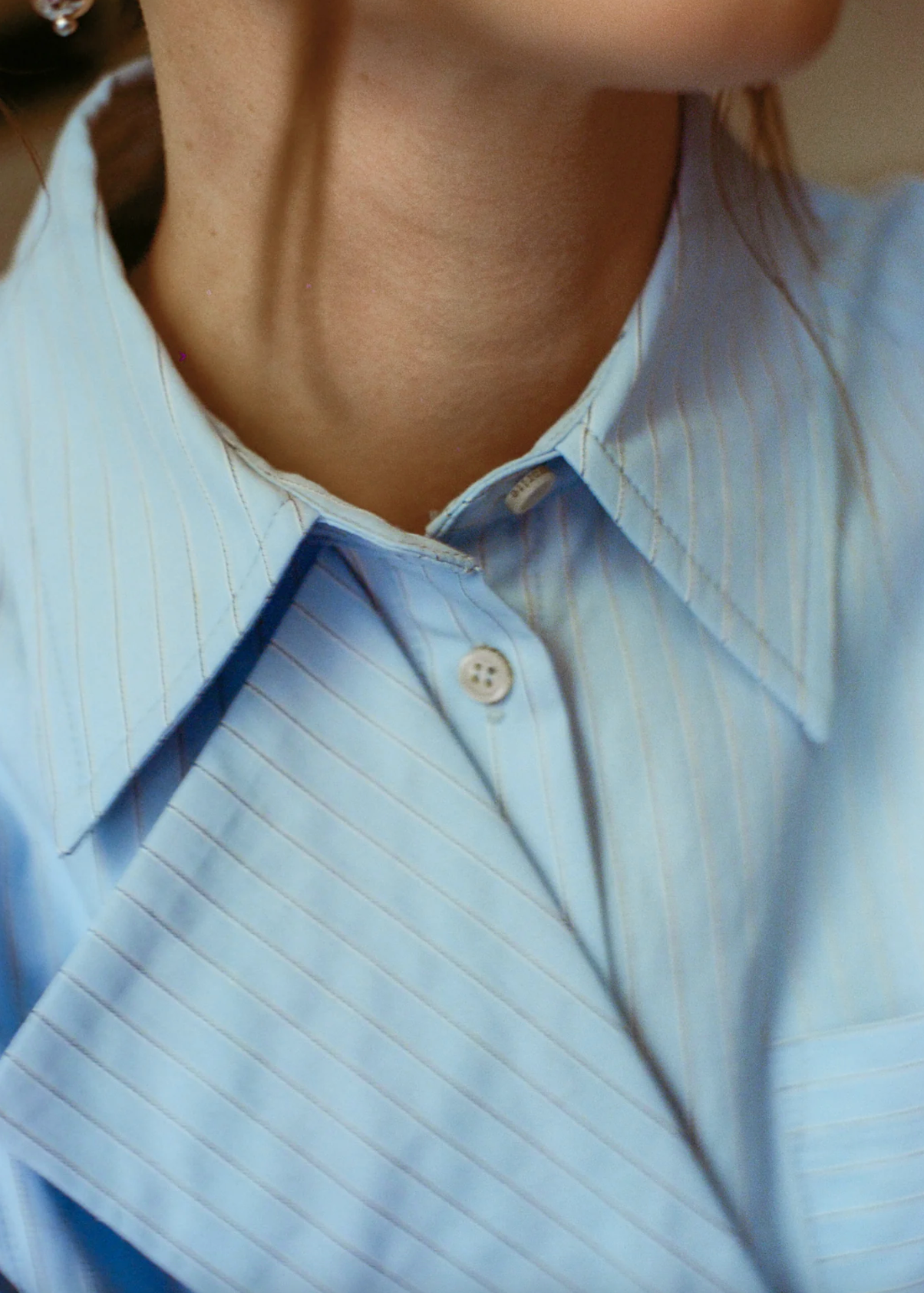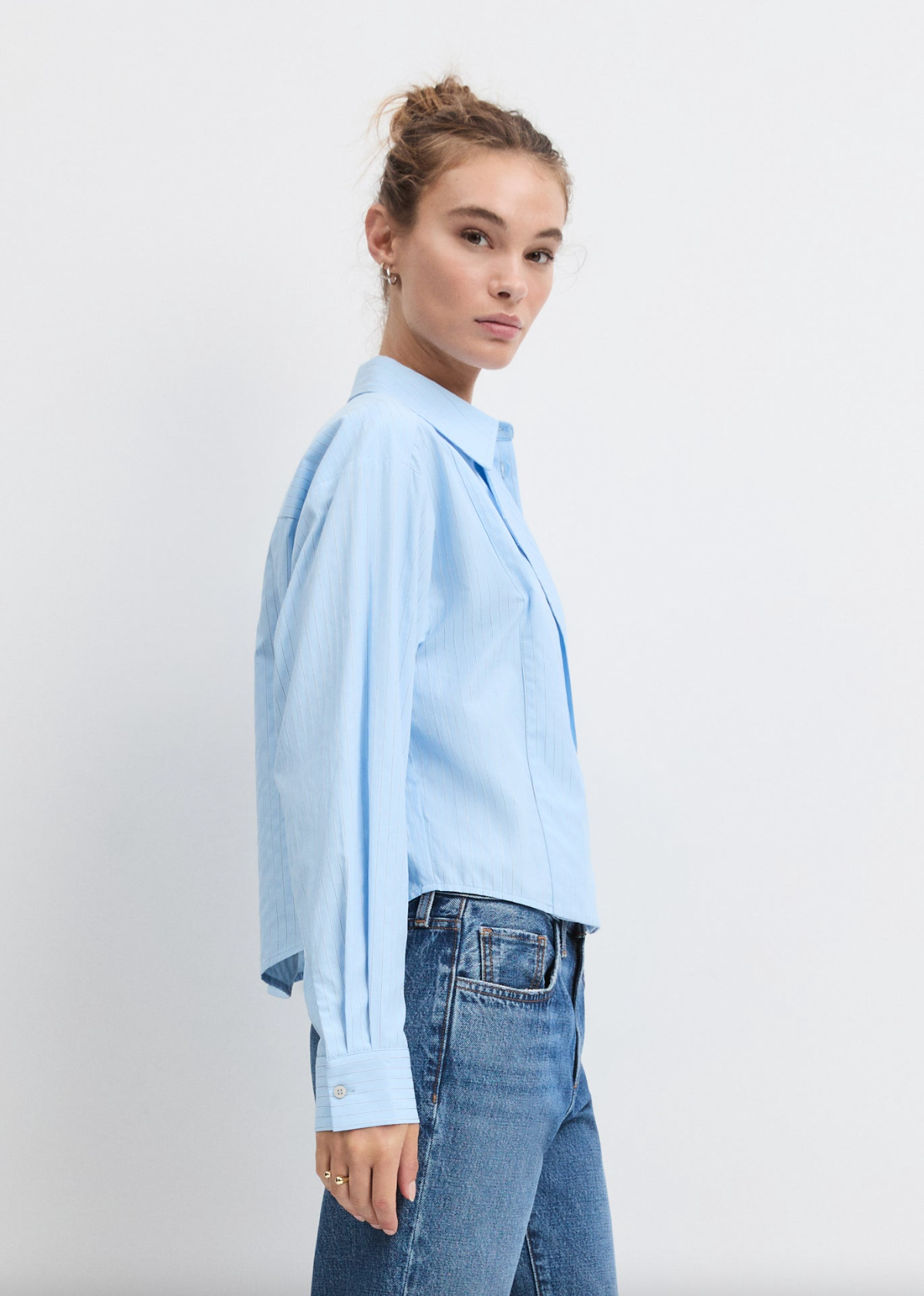 A collared shirt, reworked. The Jenni Top in Light Blue Stripe is boxy, slightly cropped, and finished with a wrapped detail that makes it feel like a favorite.