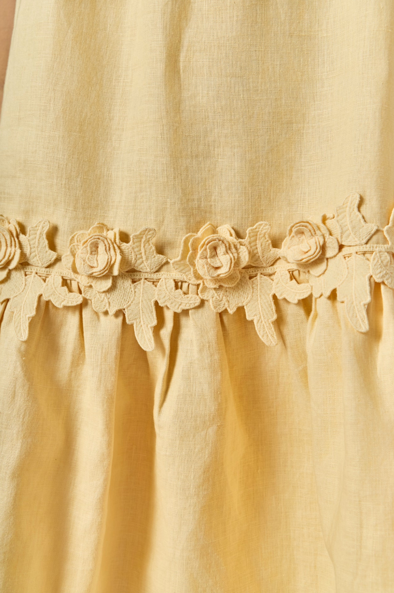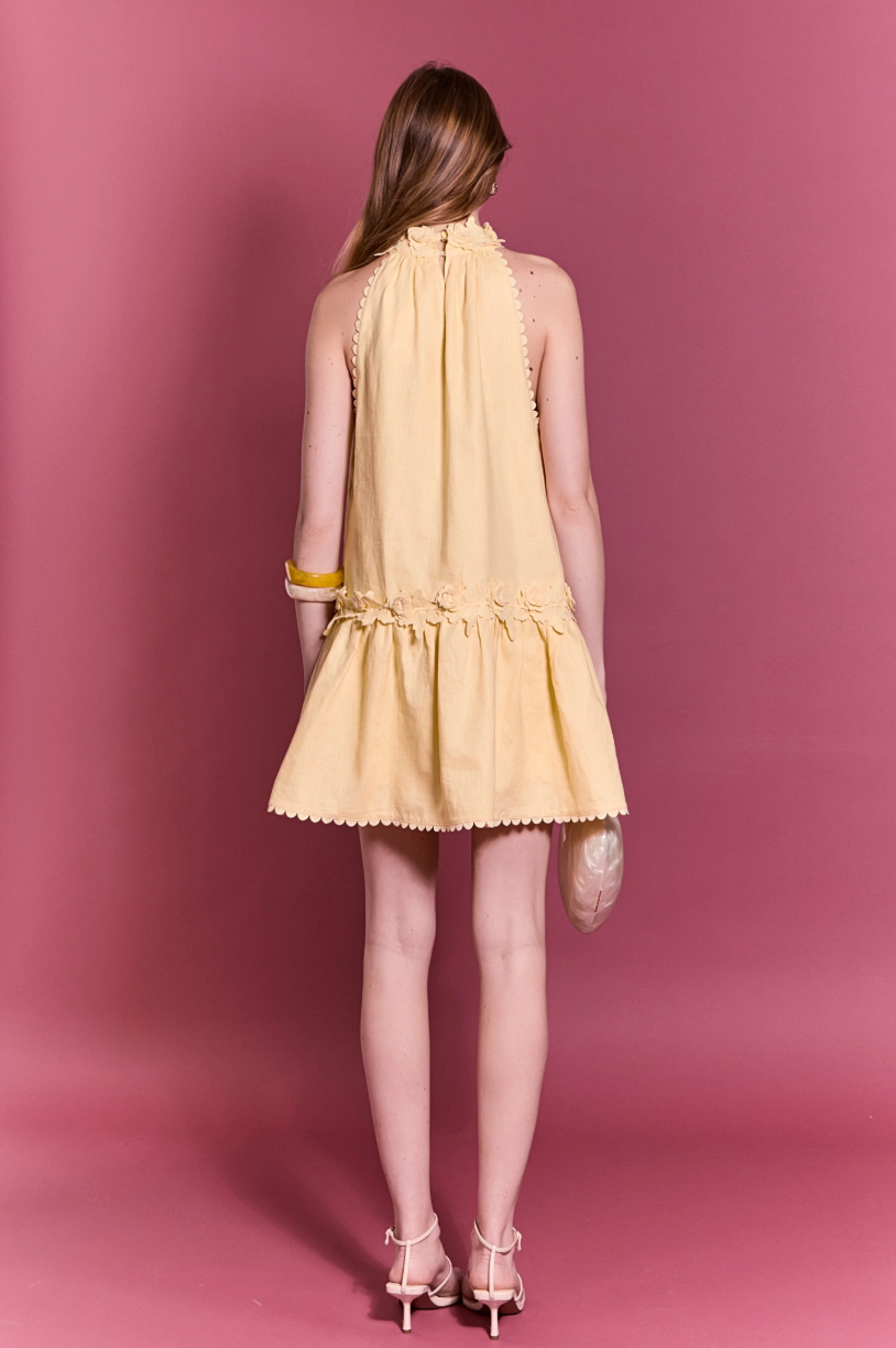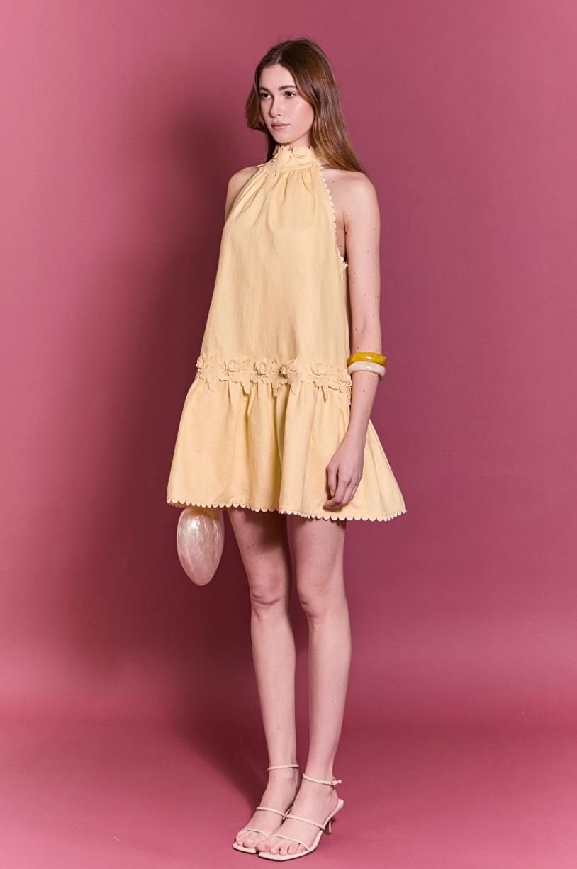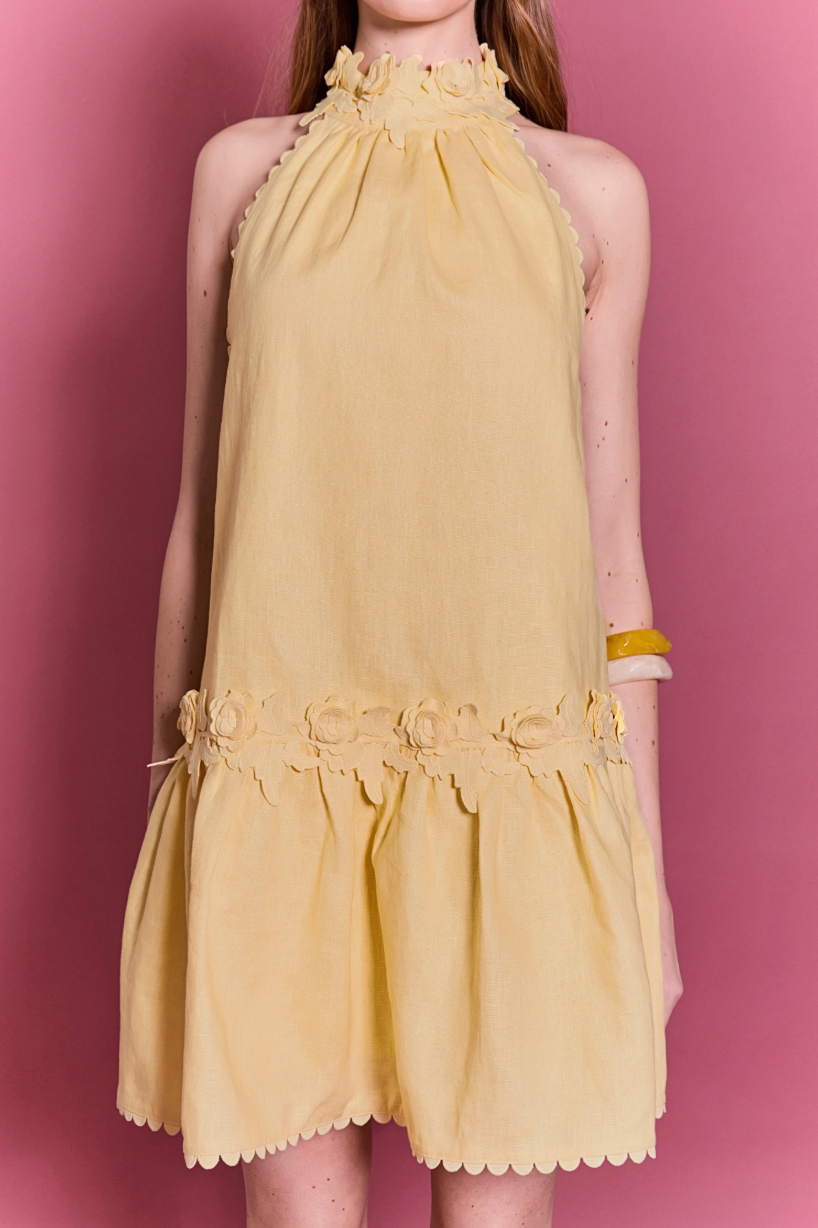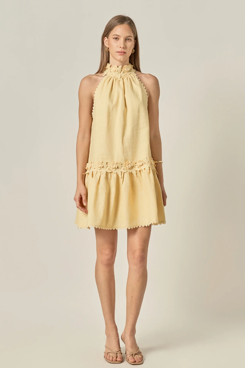 Soft, airy, and effortlessly feminine, this Scalloped Halter Linen Mini Dress is designed with delicate scalloped trim and floral appliqué accents for a romantic finish. The high halter neckline creates a flattering silhouette, while the relaxed mini length and breathable linen fabric make it perfect for warm days. Finished with a back button closure and fully lined for comfort, this dress transitions seamlessly from daytime events to summer evenings.