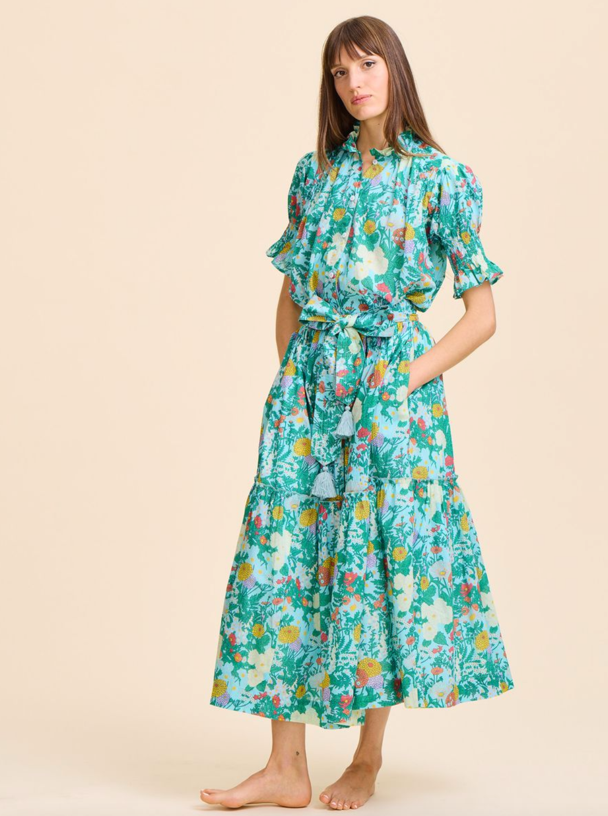 Our Françoise skirt is perfect for effortless and elegant dressing. Full length with a wide elastic waistband and belt loops to secure the coordinating belt. Top stitching along the length of the belt provides weight and structure with a delightful tassel at each end. Subtle ruffle detail on the skirt which creates just enough volume.