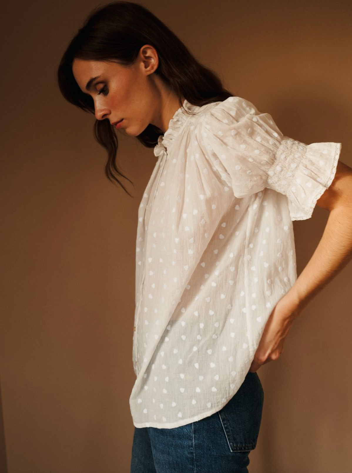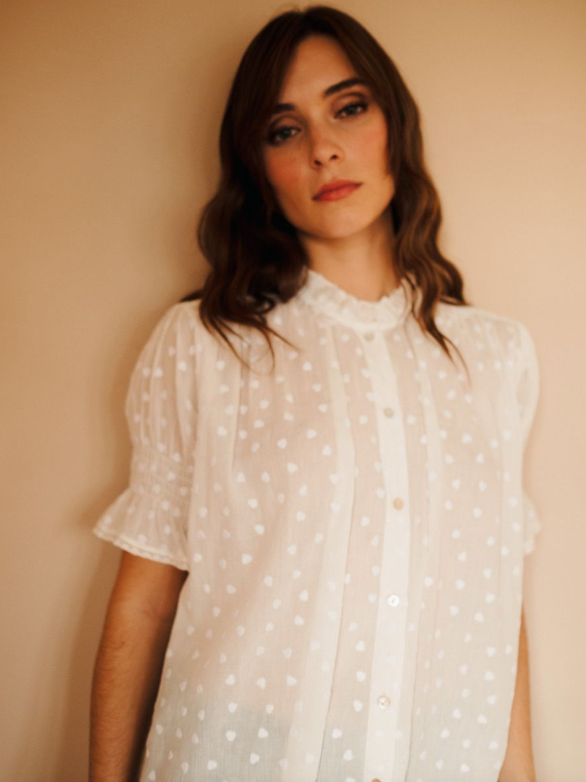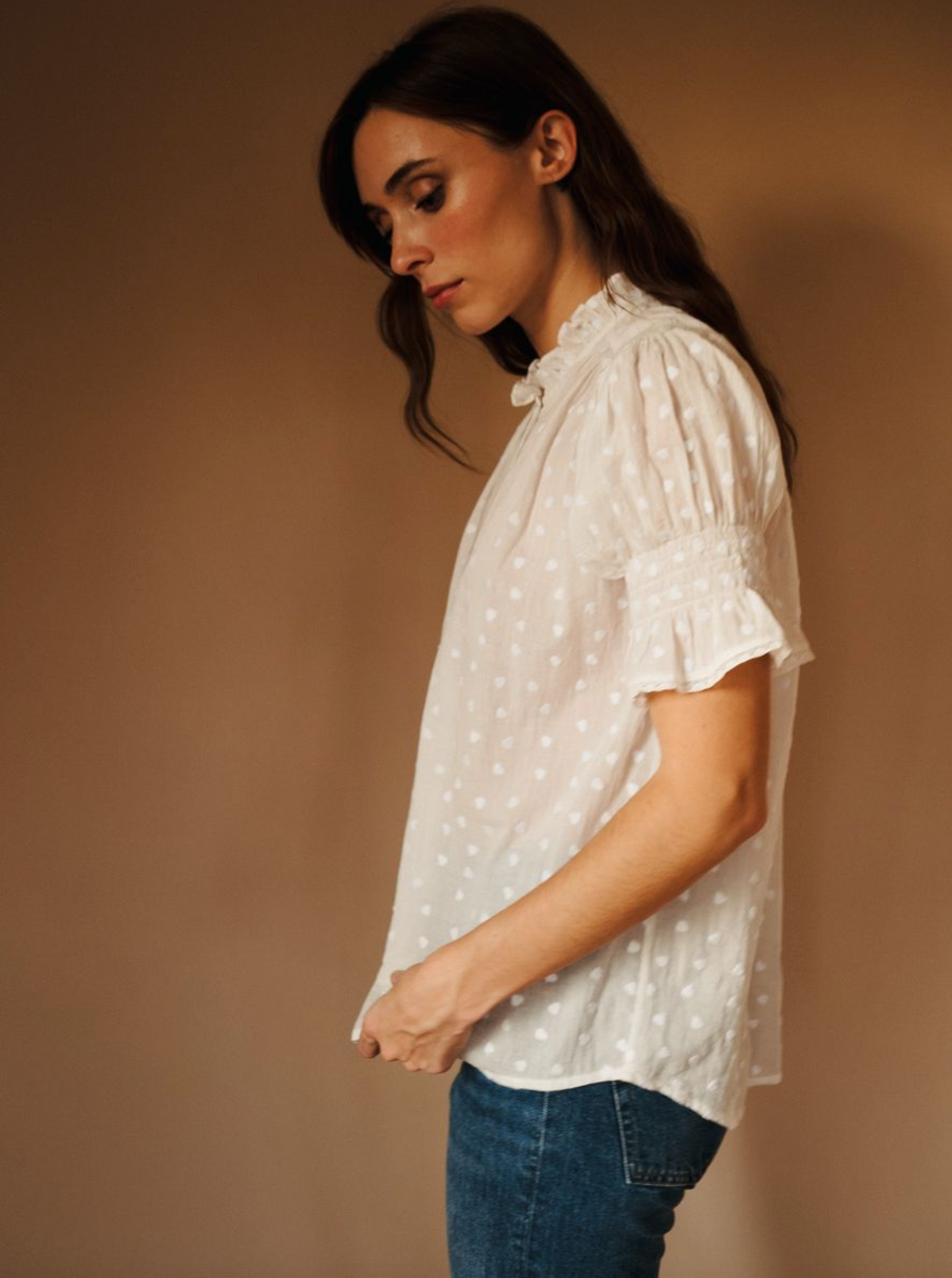 The Marnie button down blouse features a short sleeve with a smocked elastic cuff and a delicate ruffle detail along the neckline.