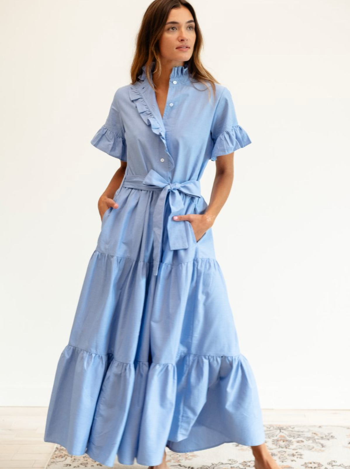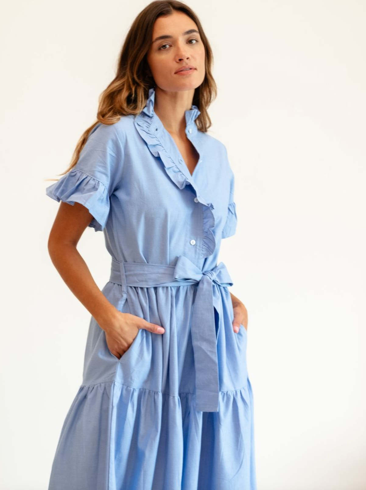 Victoria is a Mille staple. We added a tiered maxi skirt, to our best-selling Vanessa top et Voilà! Victoria has volume and movement but also looks clean and pulled together. The belted waist creates shape and a polished look. Button down top with ruffle placket and sleeve detail.