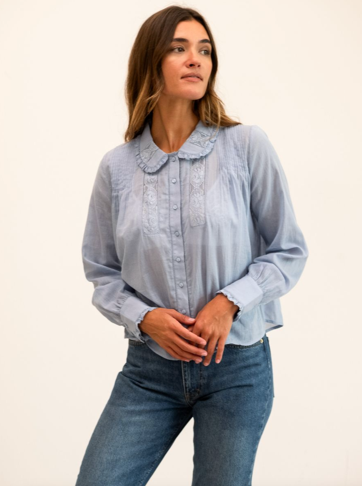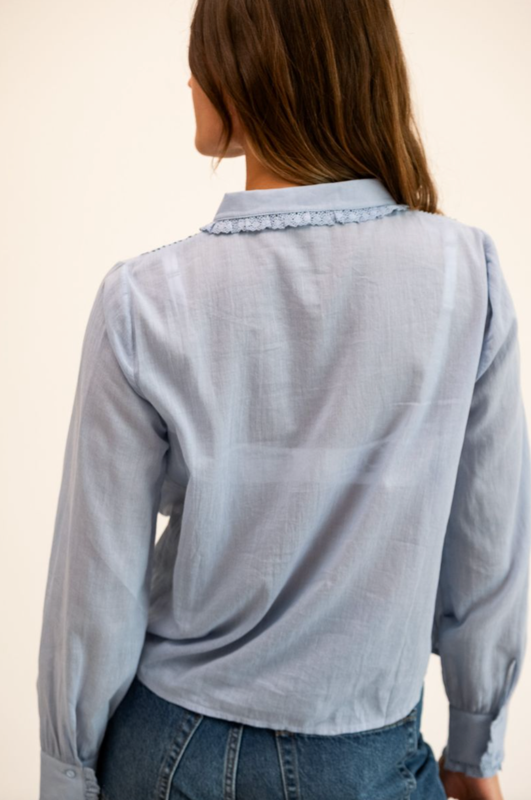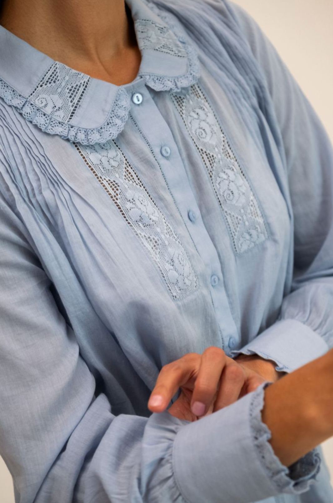 The Calista top is vintage inspired and crafted in soft cotton voile. It features a delicate lace neckline, lace insets along the length of the full billowy sleeves and finished with lace ruffle cuffs. Neckline is finished with a self tie and button front.