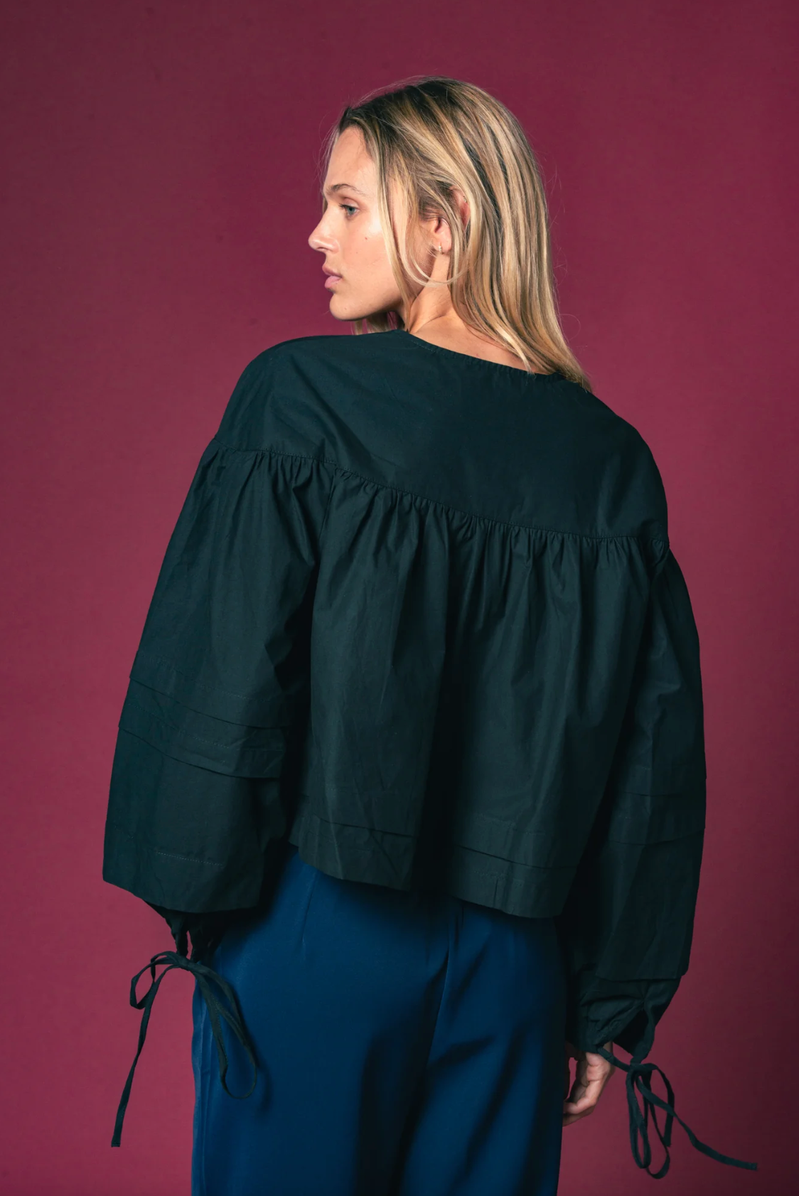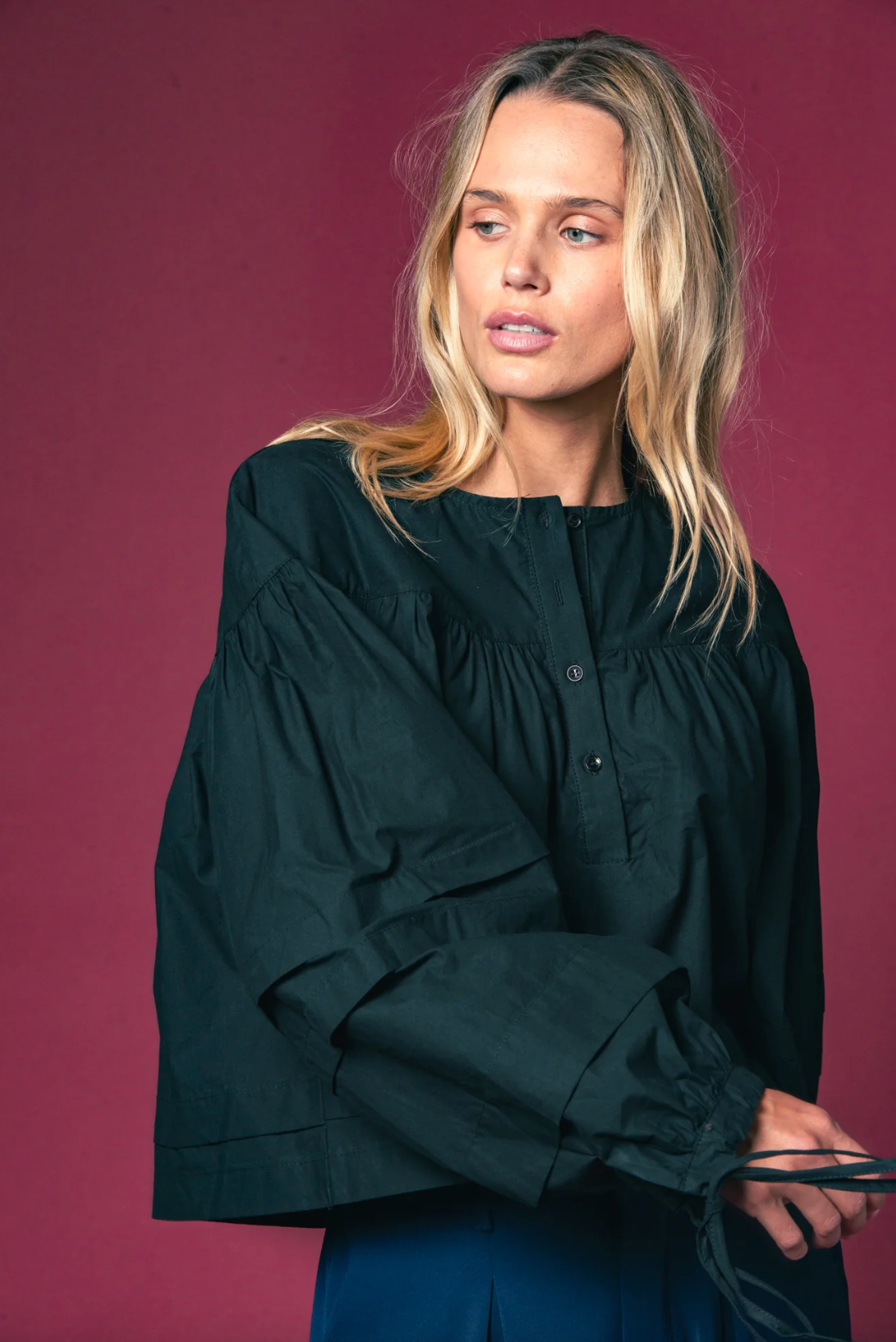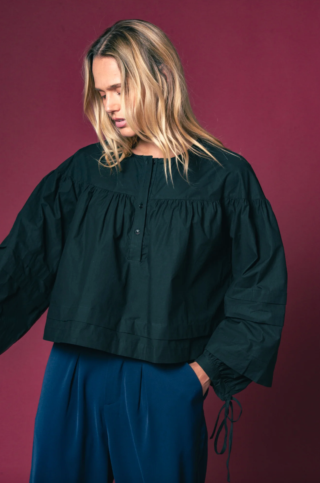 Cropped at the perfect point to kiss your waistband, The Callah Shirt has a slightly trapeze shape with ties a the wrists. In our crisp poplin in every of-the-moment color of the season.